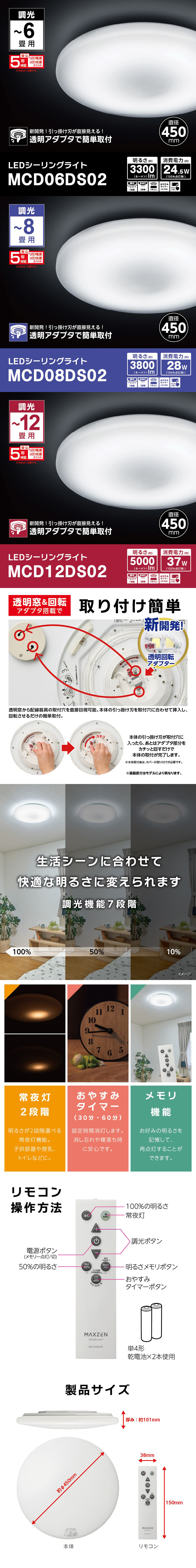 | 製品名 | シーリングライト 6畳(単色調光) | シーリングライト 8畳(単色調光) | シーリングライト 12畳(単色調光) | |